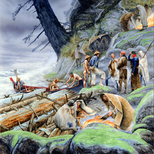 The expedition makes the best of their poor location in a small niche exposed to high waves and driving rain. Five Kathlamet visitors skillfully cross the Columbia in a canoe loaded with fish.