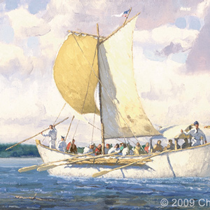 Below present Van Hook Arm, North Dakota, a sudden gust of wind hits the white pirogue with Charbonneau at the helm. In his panic, he turns the boat sideways to the wind and nearly turns it over. Those walking the shore see grizzly bear tracks and empty Assiniboine lodges.