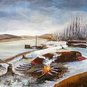 At Fort Mandan, the enlisted men continue making charcoal for the blacksmiths and trying to free the boats from the Missouri River ice. At the Knife River Villages, a band of Assiniboine traders arrives.