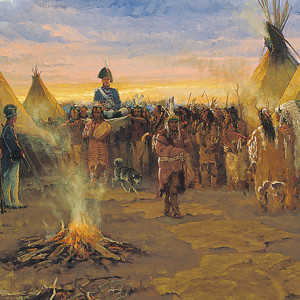 Clark and Lewis are ceremoniously carried into a Lakota Sioux village where they are feted with food and music. Clark sees several recently captured Omaha prisoners and asks for their return.