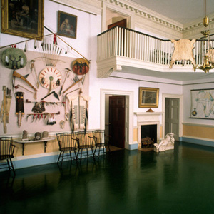 Bostonian George Ticknor catalogued the “strange furniture” of the four walls of the room after his visit in 1815, listing heads and horns, “curiosities which Lewis and Clark found on their wild and perilous expedition,” mastodon bones, and the two Native American painted hides.