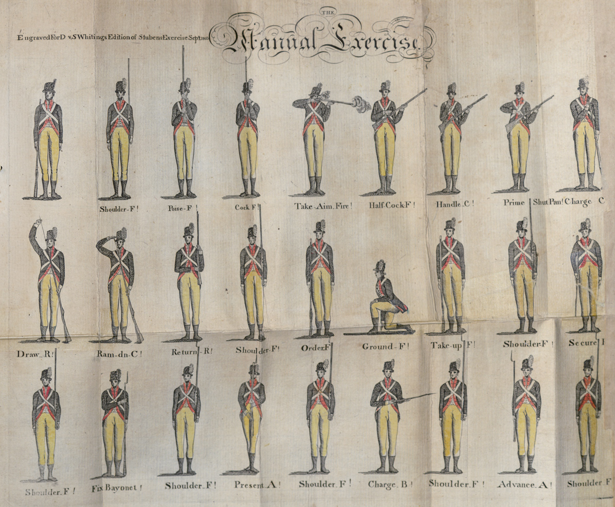 The first major objective of basic training was mastery of the “Manual Exercise,” or manual of arms. It involved 27 commands from the sergeant, calling for 56 motions by the recruit. The single command, “Prime and Load,” involved fifteen motions.