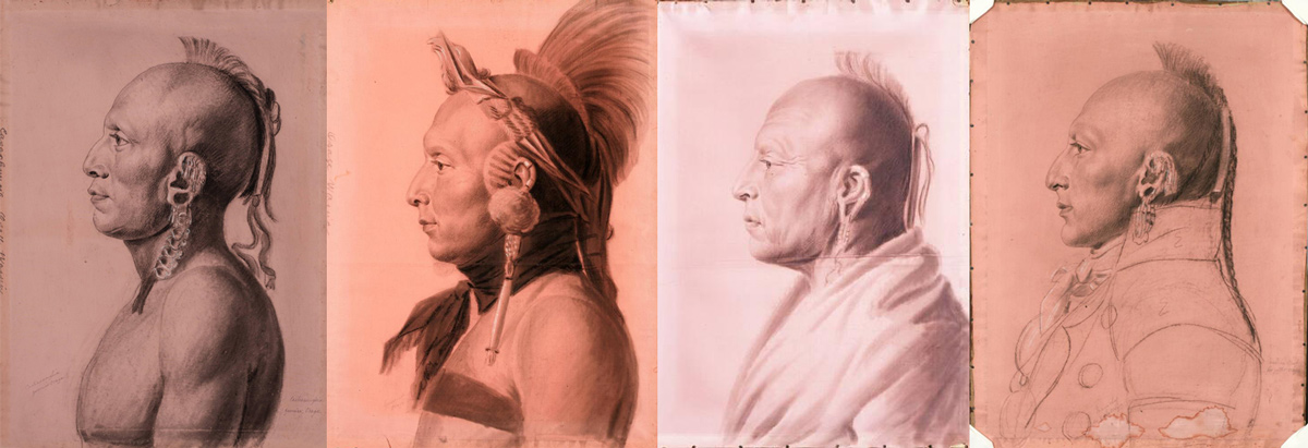 With the aid of a physiognotrace, St. Mémin executed portraits of at least five Osage men who visited Washington City summer 1804 and winter 1806–1807. Only the first one (above left) includes his name in its label: Cachasunghia.