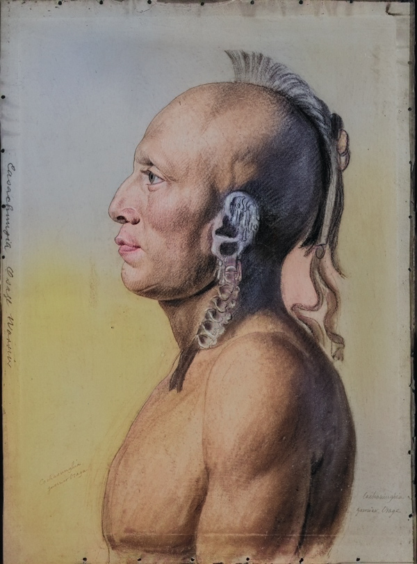 Colorized and altered 2025 by Kristopher K. Townsend. The original is charcoal with stumping, Conté crayon, and black and white chalk on pink prepared paper nailed over canvas on a wooden frame. For the original, see The New York Historical, emuseum.nyhistory.org/objects/41610/cachasunghia-osage-warrior.