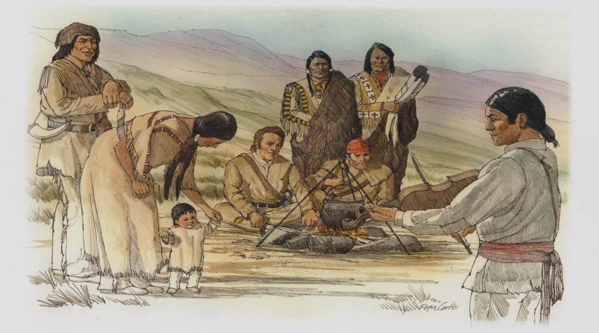 The fiddle is played and Sacagawea encourages Jean Baptiste Charbonneau to dance. William Clark and the two Nez Perce chiefs watch. Throughout the expedition’s journey down the Clearwater, Snake, and Columbia Rivers, Twisted Hair and Tetoharsky served as guides, interpreters, diplomats among the various Sahaptian-speaking Nations they encountered.
