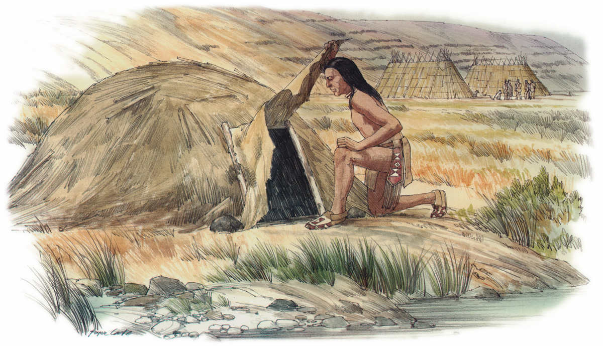 The captains mention Nez Perce sweat lodges multiple times along the Clearwater and Snake Rivers. The lodges were typically built near water where they could find willows for frames, stones for heating, and cold water for plunging after a good sweat. Above, the artist depicts a Palouse man entering a sweat lodge along the Snake River as described by William Clark on 11 October 1805.
