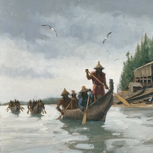 After a night made sleepless by noisy waterfowl, the expedition heads down the Columbia. They pass the large village known today as Cathlapotle and encounter various Chinookan People.